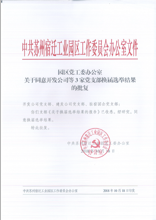 園區(qū)黨工委辦公室 關于同意開發(fā)公司等3家黨支部換屆選舉結(jié)果的批復