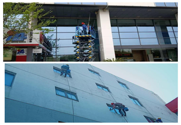 在安全施工的同時嚴格保證服務(wù)質(zhì)量,根據(jù)實際情況制定專業(yè)清潔方案,選用專業(yè)外墻清洗劑和玻璃清潔劑,結(jié)合使用了升降機、吊繩等方式進行施工操作,對管理樓外墻、幕墻、瓷磚墻面、燈具及道路等衛(wèi)生死角徹底清潔。