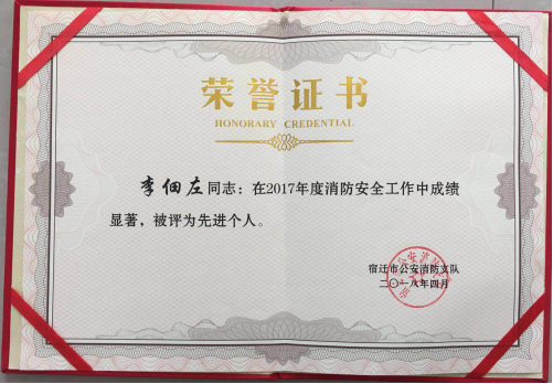 5月2日下午,宿遷市公安消防支隊召開了“全市一級消防安全重點單位“工作會議,建發(fā)公司物業(yè)部安防主管李佃左同志在2017年消防安全工作中成績顯著,被評為先進(jìn)個人。