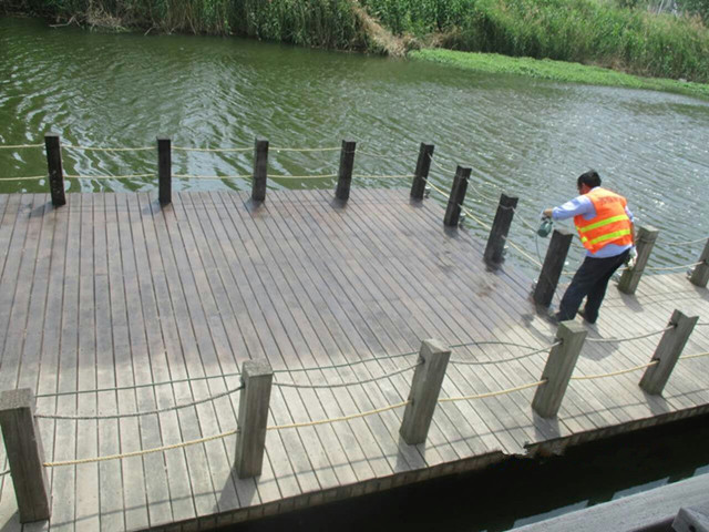 維保工作首先從為民河公園開始。為民河公園于201212月竣工投入使用,為園區(qū)最早建成的景觀公園之一。公園內(nèi)有賈拉木棧道約570平方米,硬木扶手、欄桿約402米。隨著使用年限增加,公園部分設(shè)施特別是木棧道、親水平臺等逐漸發(fā)生了老化,木材表面出現(xiàn)不同程度的褪色和裂紋,影響了親水平臺的景觀效果。為此,公司先安排維保人員對破損處進(jìn)行維修,然后清掃干凈噴漆,待自然晾干后開放通行,給親水平臺穿上了新“嫁衣”。