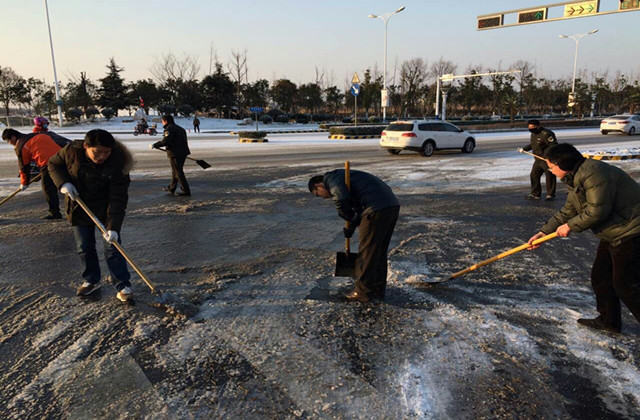 清晨6時(shí),市政部工作人員和環(huán)衛(wèi)工人已經(jīng)開始對轄區(qū)部分主要路段進(jìn)行除雪除冰作業(yè)。在凜冽寒風(fēng)中,他們不畏嚴(yán)寒,經(jīng)過近3小時(shí)的清掃除冰,截至上午9時(shí),青海湖西路、通達(dá)大道、紫金山路等主干道及蘇州公園人行道已基本完成路面積雪清掃。